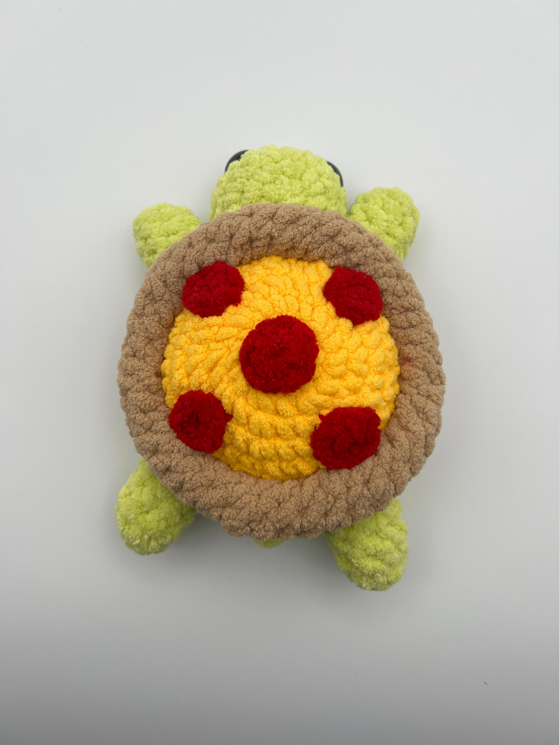 This adorable little turtle has a pizza shell! The pattern provides options for 3 toppings: pepperoni, ham, and pineapple.