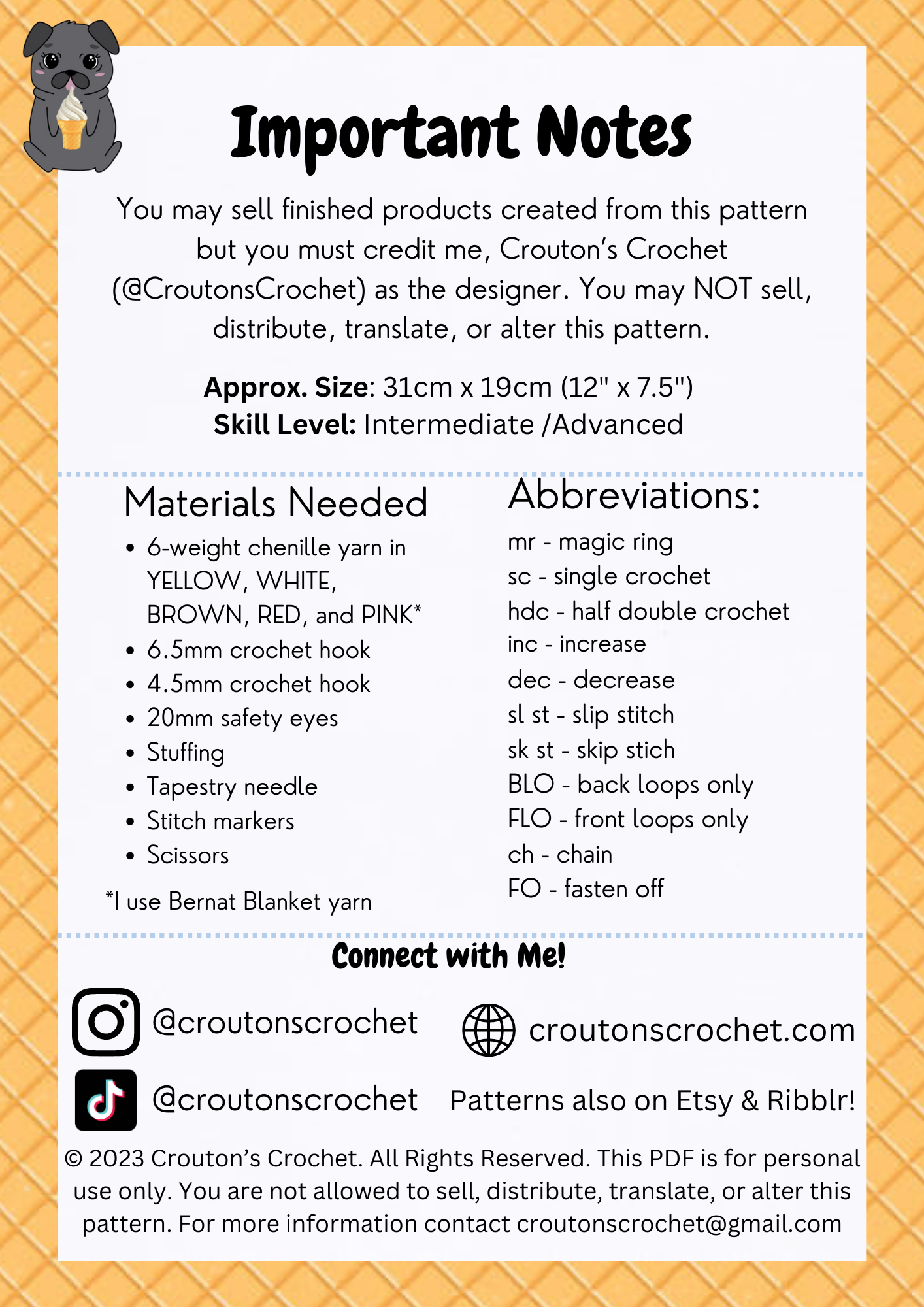 Please do not copy or redistribute any part of this pattern as your own. You may sell finished products made using this pattern but you must credit me @croutonscrochet on Instagram or croutonscrochet@gmail.com