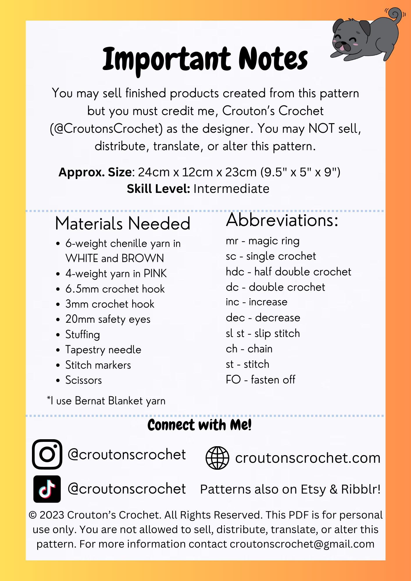 Please do not copy or redistribute any part of this pattern as your own. You may sell finished products made using this pattern but you must credit me @croutonscrochet on Instagram or croutonscrochet@gmail.com