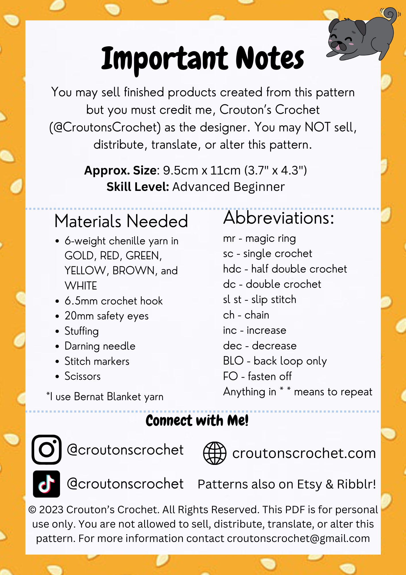 Please do not copy or redistribute any part of this pattern as your own. You may sell finished products made using this pattern but you must credit me @croutonscrochet on Instagram or croutonscrochet@gmail.com