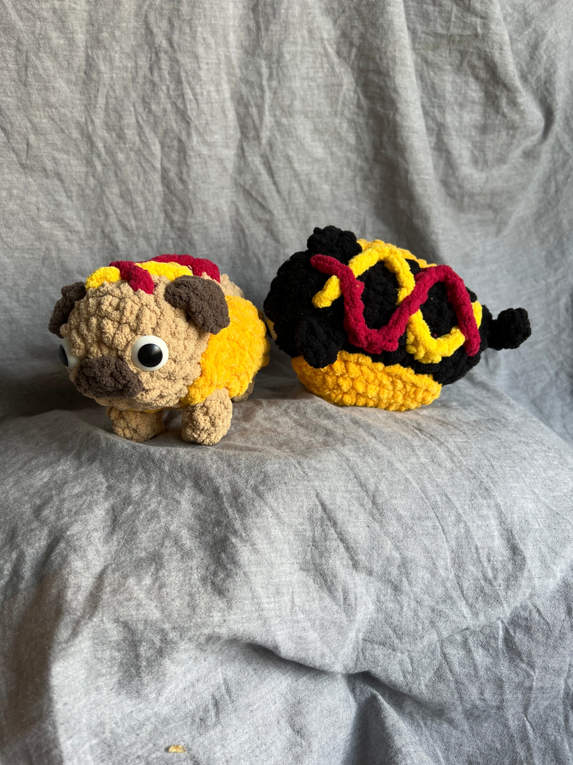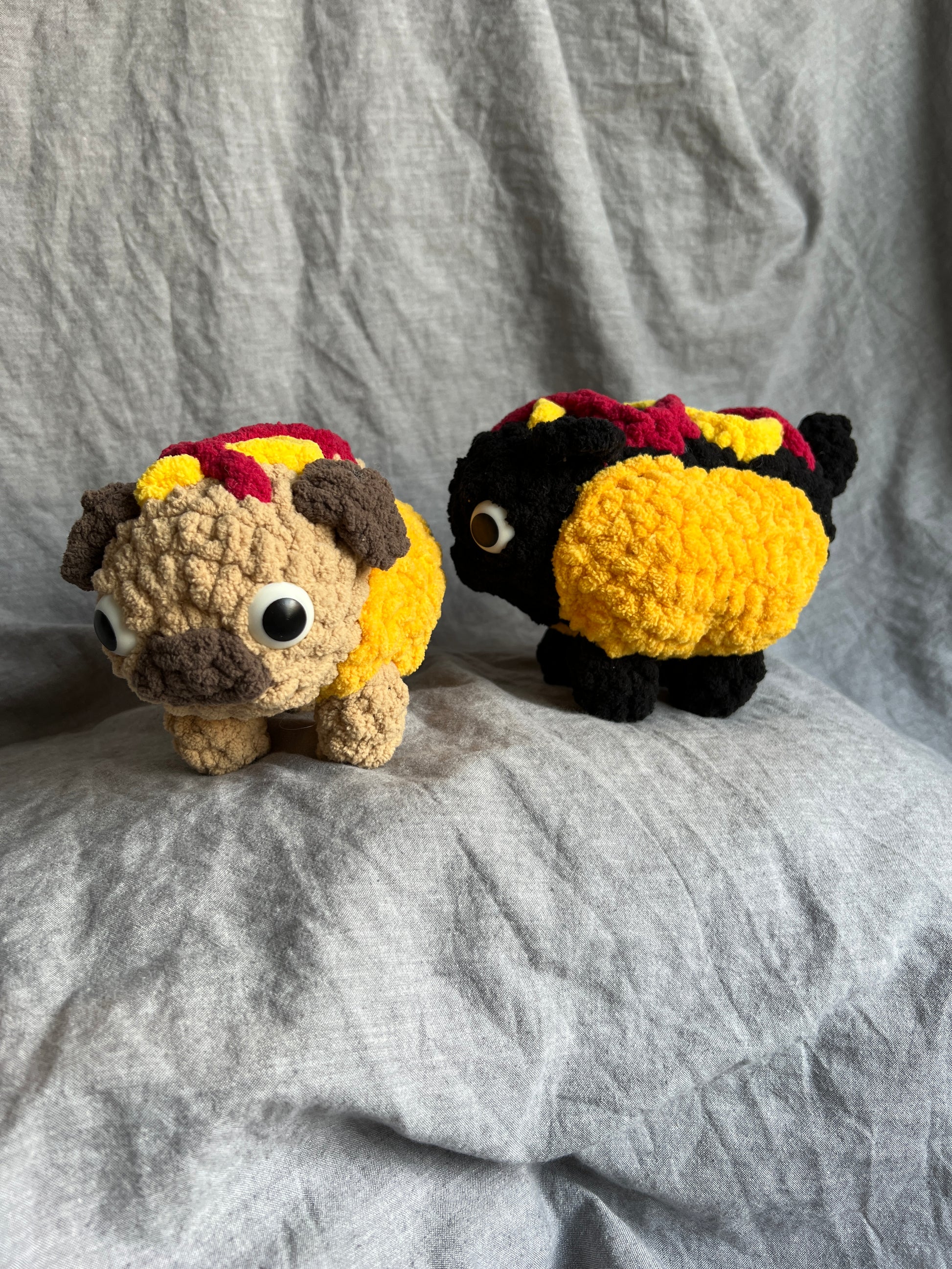 •    6 weight super bulky chenille yarn in RED, YELLOW, GOLD, and BLACK or BROWN and BEIGE (Depending on pug color)