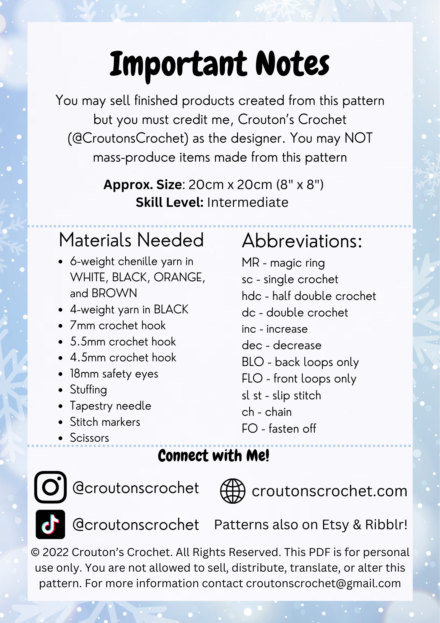 Please do not copy or redistribute any part of this pattern as your own. You may sell finished products made using this pattern but you must credit me @croutonscrochet on Instagram or croutonscrochet@gmail.com