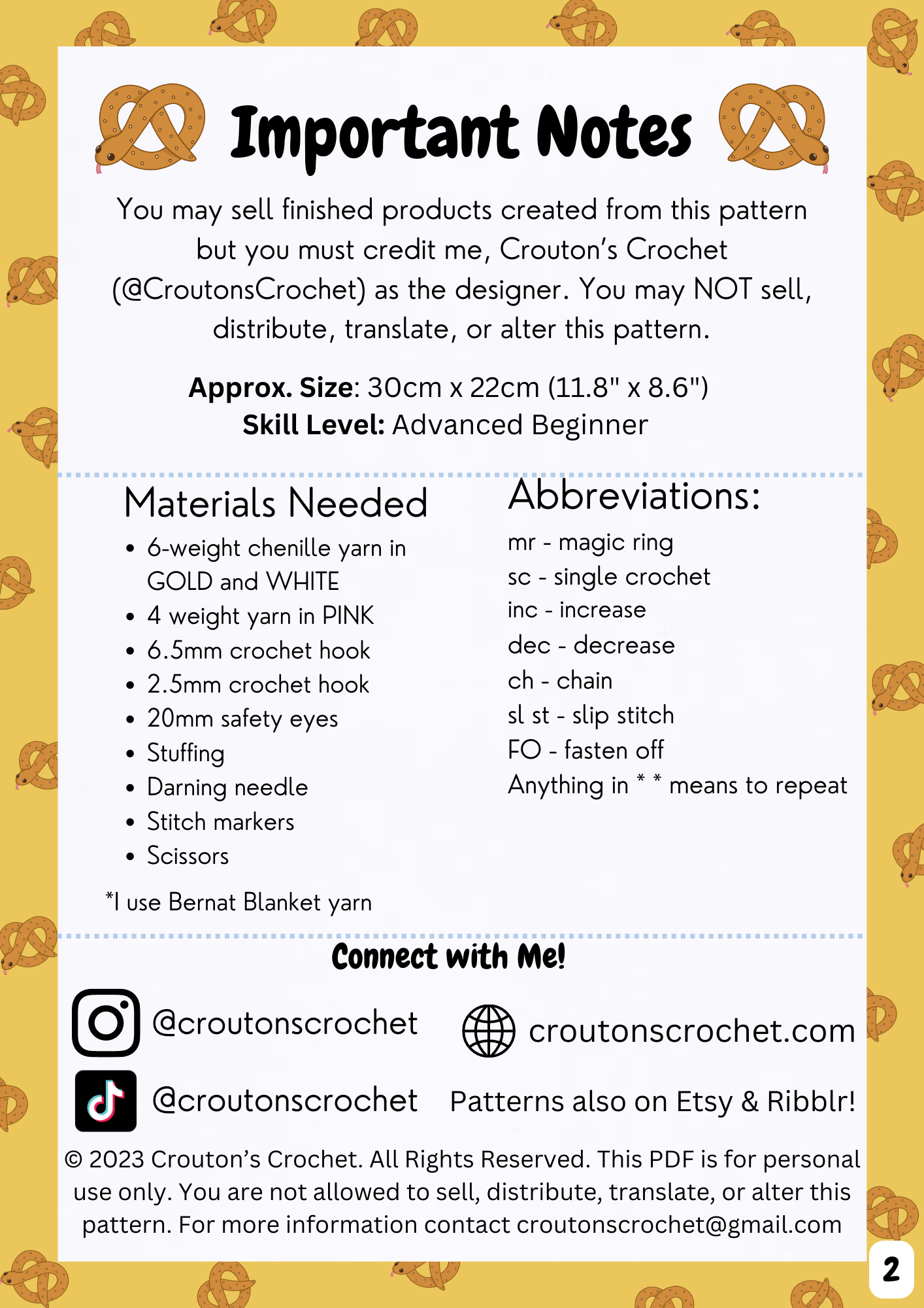 Please do not copy or redistribute any part of this pattern as your own. You may sell finished products made using this pattern but you must credit me @croutonscrochet on Instagram or croutonscrochet@gmail.com