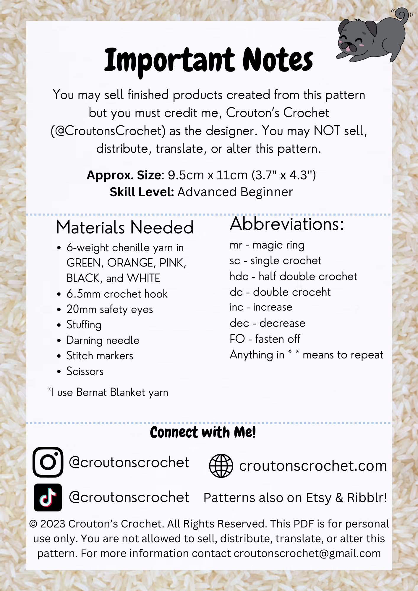 Please do not copy or redistribute any part of this pattern as your own. You may sell finished products made using this pattern but you must credit me @croutonscrochet on Instagram or croutonscrochet@gmail.com