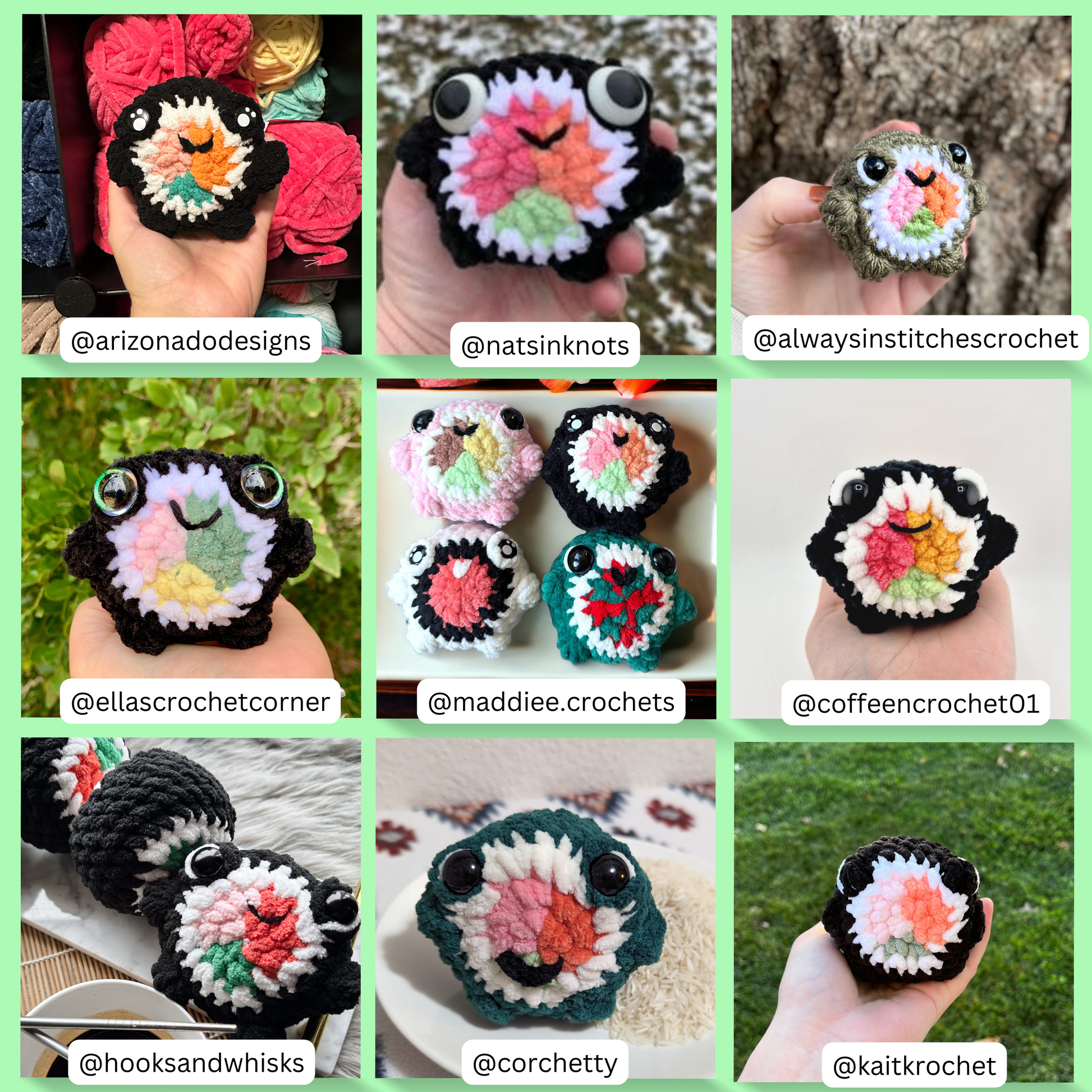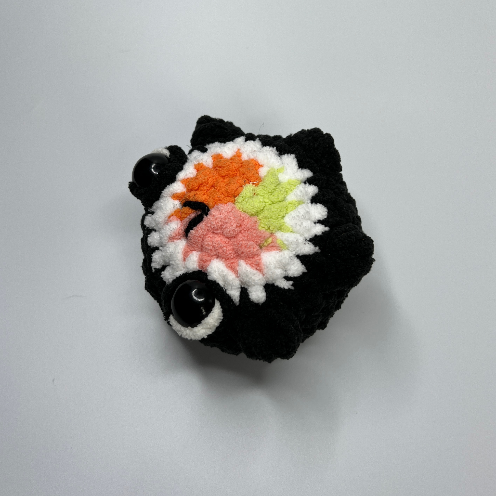 Meet the Sushi Frog! This design works up swiftly and requires no sewing. Easily customizable; simply alter the colors of the filling to craft unique variations. Perfect for markets or presents.